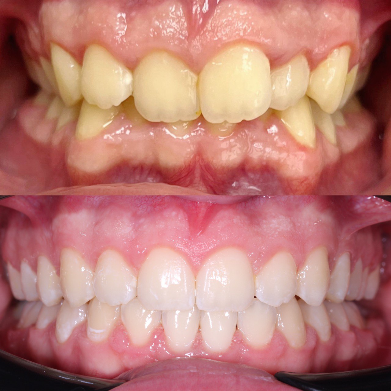 Девушка,25 лет. Исправление положения нижней челюсти при лечении дисфункции ВНЧС на брекет-системе H4. Срок лечения 1 год.